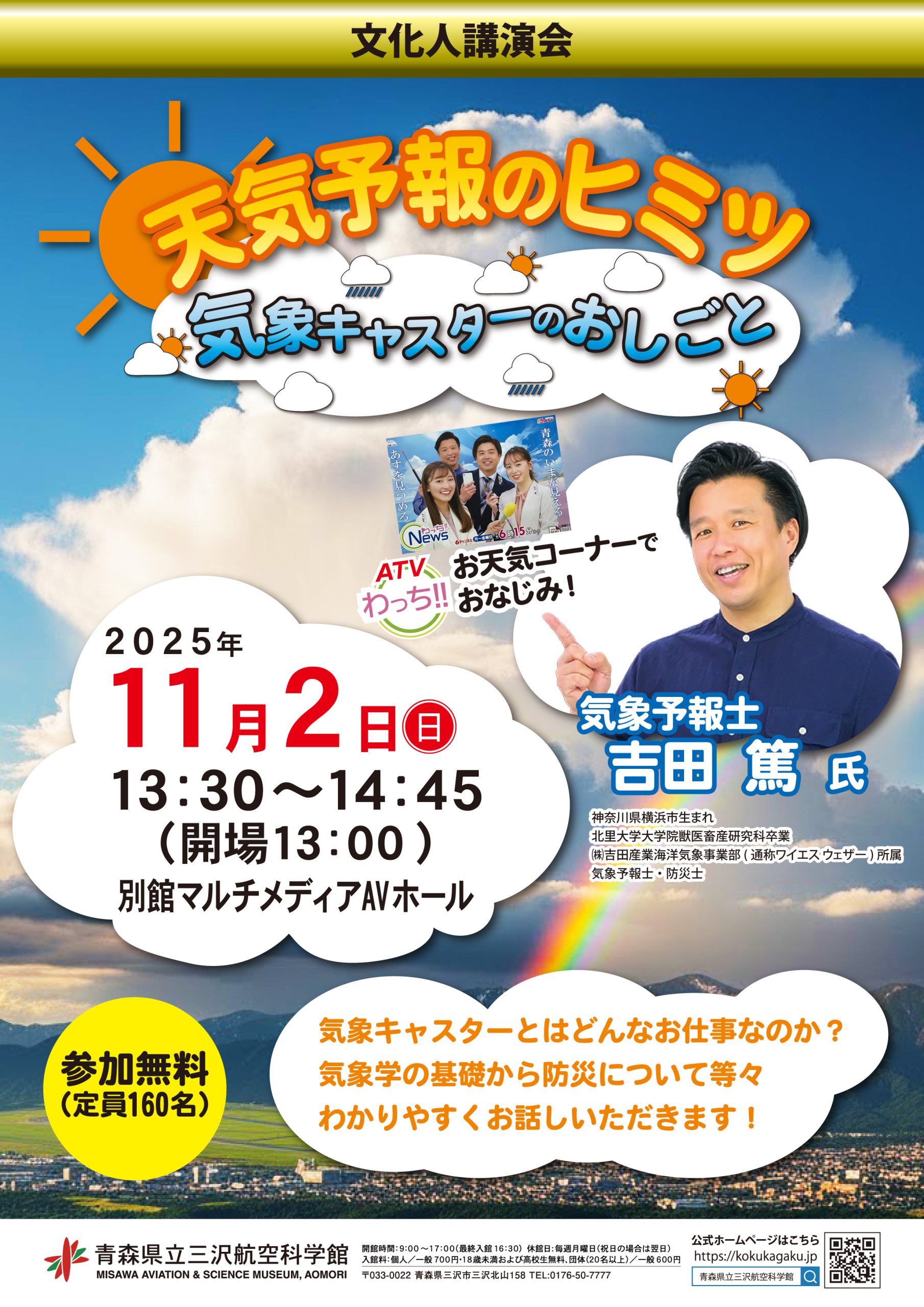 - 【ATVわっち‼】内のお天気コーナーでお馴染みの気象予報士 吉田篤氏による講演会を行います。