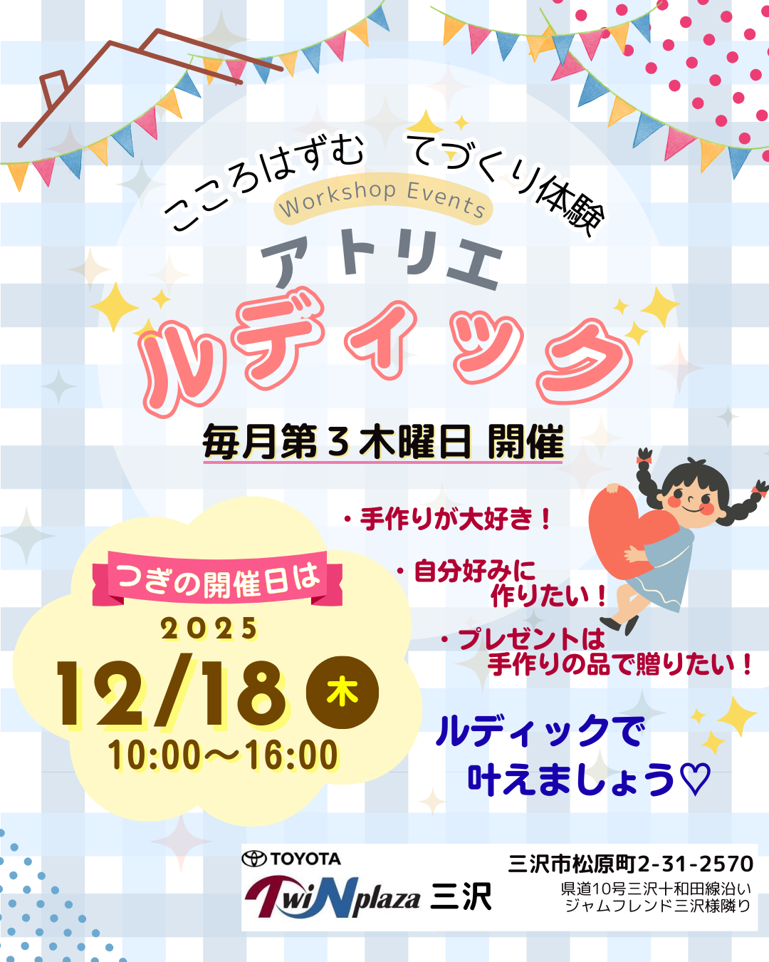 - 「~こころはずむ てづくり体験~ アトリエ ルディック」は、三沢市内で毎月第3木曜日に開催されているハンドメイド体験イベントです。